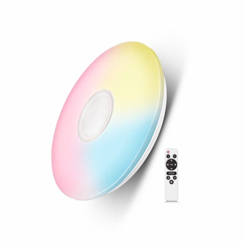 Moderna LED plafonjera s ugrađenim Bluetooth zvučnikom koja spaja rasvjetu i glazbu u jednom uređaju. Omogućuje promjenu boje svjetla (CCT + RGB), podešavanje jačine osvjetljenja i upravljanje glazbom putem daljinskog upravljača ili pametnog telefona.