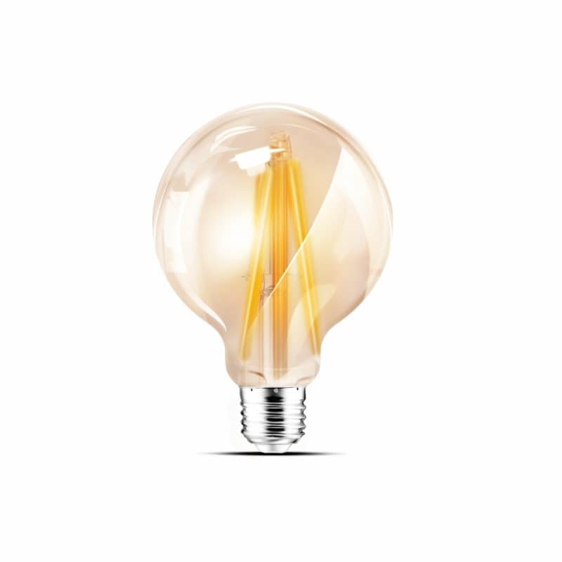 Dekorativna LED filament žarulja velikog G125 formata s amber staklom i toplim bijelim svjetlom (2700K), idealna za stvaranje ugodne i ambijentalne rasvjete u interijerima. Zahvaljujući vidljivim filamentima i širokom kutu svjetla, savršeno se uklapa u otvorene svjetiljke, lustere, visilice i dekorativne lampe.